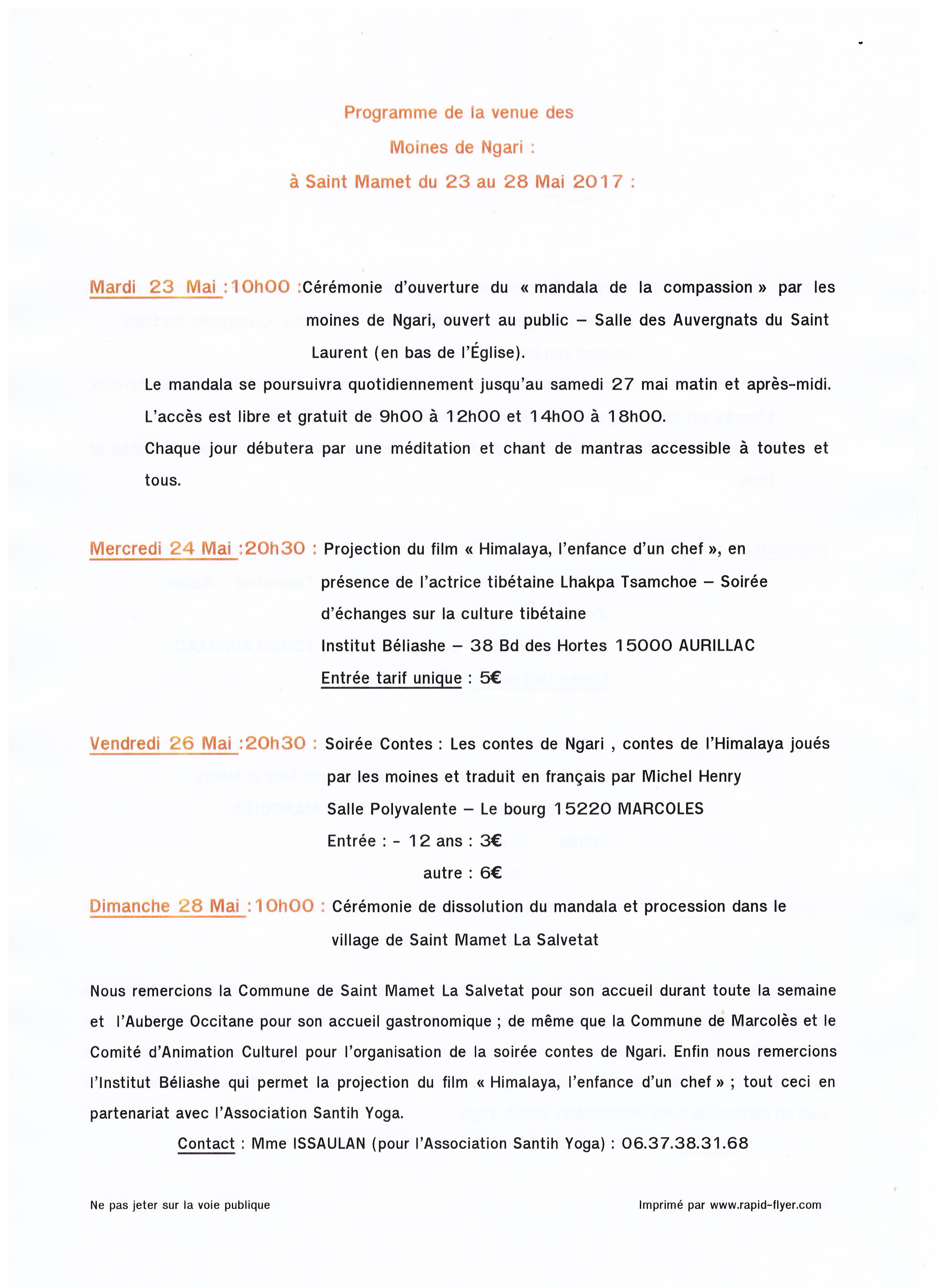 L’Association Santih Yoga, en partenariat avec la Commune de Saint Mamet, a eu le plaisir d’accueillir Guéshé Lobsang Norbou, moine bouddhiste du Khangtsène de Ngari pour la réalisation du mandala du Bouddha de la Compassion. Quatre autres moines devaient participer à la tournée européenne des arts sacrés de l'Himalaya", mais n'ont malheureusement pas pu obtenir leur visa.